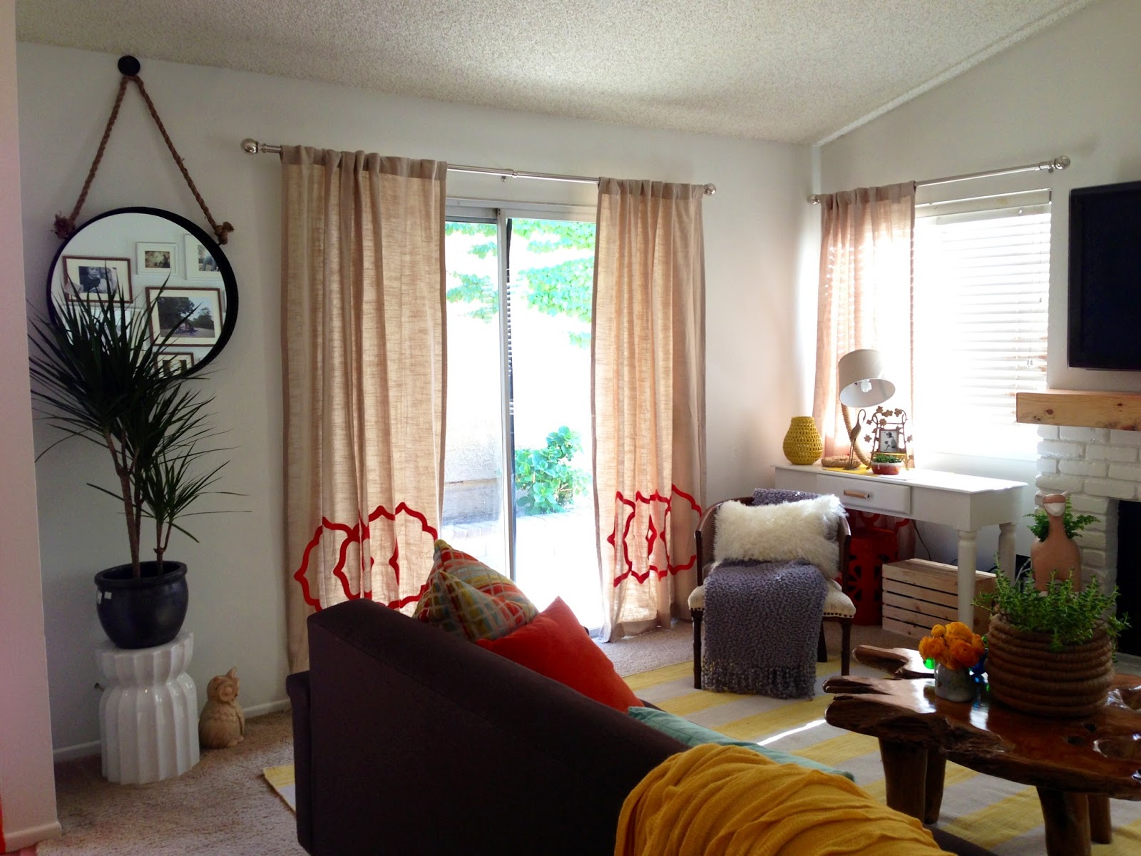 Cane-back bamboo-legged chair - G3QDesigns. White tassel garden stool, rope hung industrial mirror - Home Goods. Curtains & rods - Target.